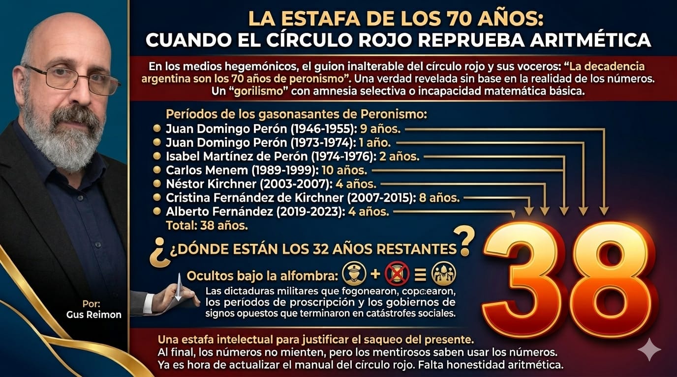 En el ecosistema de los medios hegemónicos, existe un guion inalterable. Es una pieza de oratoria que el círculo rojo ha ensayado hasta el hartazgo y que sus voceros repiten con la precisión de un metrónomo: “La decadencia argentina son los 70 años de peronismo”. Lo dicen con tono de cátedra, lo grafican con curvas descendentes y lo venden como una verdad revelada.